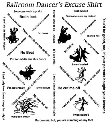 Then you need these list of excuses from the Ballroom Dancer's Excuse Shirt (image of shirt layout here) derived from the Skydiver's Excuse Shirt: